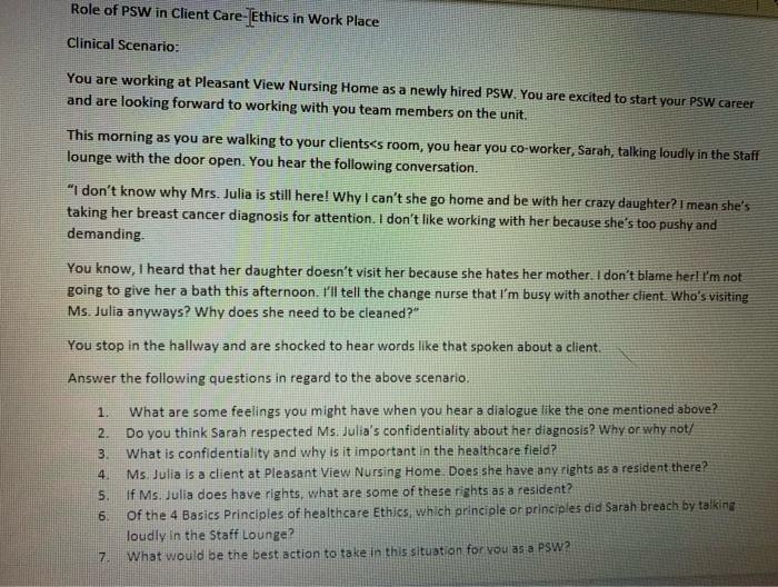 Solved Role Of Psw In Client Care Ethics In Work Place Chegg Com